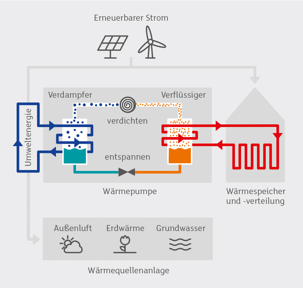 Eine Wärmepumpe entzieht mithilfe von stromangetriebenen Kompressoren thermische Energie aus einer Wärmequelle (z.B. Außenluft, Erdsonden, Erdkollektoren, Grundwasser, Abwasser) mit niedriger Temperatur und stellt die Energie einem System mit höherer Temperatur zur Verfügung.