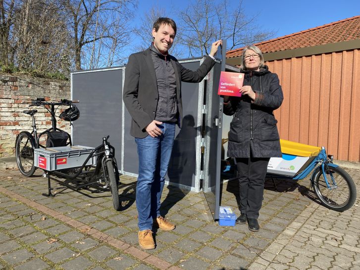Klimaschutzmanagerin Heidrun Brümmendorf hat heute gemeinsam mit Matthias Wohlfahrt, Leiter der Geschäftsstelle proKlima, die neue Fahrradgarage für das E-Lastenfahrrad „Ronja" in Betrieb genommen.Entspannt und klimaschonend können die Mitarbeiter der Stadtverwaltung mit dem Lasten-Pedelec die Wege zu Ihren Terminen und Baustellen zurücklegen und dabei auch größere Mengen an Material transportieren. Bereits in 2020 übergab Matthias Wohlfahrt das elektrisch betriebene Lastenrad Ronja an die Stadt Ronnenberg. Da das Lastenrad in keine herkömmliche Fahrradgarage passt, wurde nun ein tauglicher Unterstand beschafft. Damit das Lastenrad künftig sicher und wettergeschützt aufbewahrt werden kann, hat proKlima jetzt die passende Fahrradgarage für das Lastenrad gesponsert.