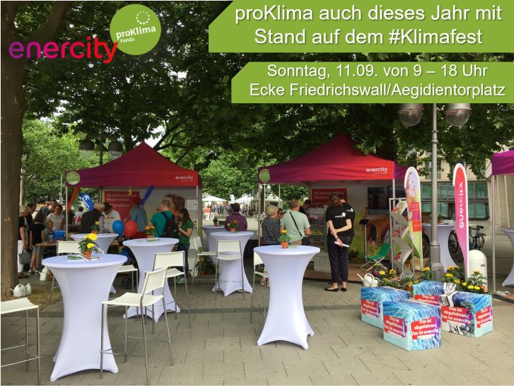 Beim diesjährigen Klimafest/Autofreien Sonntag, der zusammen mit dem 35. Entdeckertag am 11.09. stattfindet, wird proKlima auf dem Gemeinschaftsstand der enercity AG mit vertreten sein.Dort erwartet Sie ein abwechslungsreiches Angebot für jung und alt. Neben den bewährten Beratungen zur Förderung Ihrer Modernisierungsprojekte und zu innovativen Lösungen für das Eigenheim können die Gäste zudem an einem Stromsparquiz teilnehmen, was mit kleinen Geschenken belohnt wird.