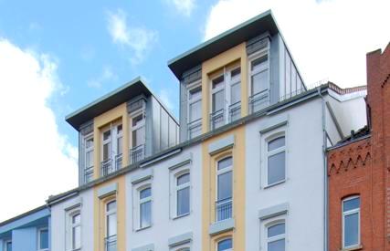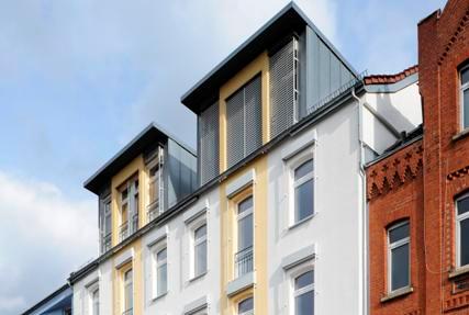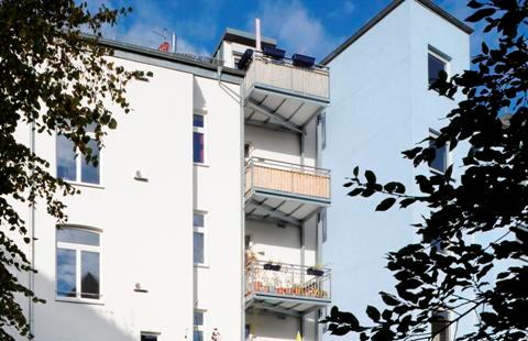 The goal of the renovation was to create simple, solidly equipped apartments with affordable rental prices. In order to minimize heat loss, the exterior walls were fitted with a mineral-wool composite thermal insulation system, Passivhaus windows were installed, and the roof was insulated with cellulose as part of the roof truss restoration work. Interior insulation on the top floor prevents heat from escaping into the neighbors' unheated attics. Due to spatial differences, the basement ceiling insulation was completed partly from above and partly from below as part of a new floor construction. Consistent use of Passivhaus components made it possible to reduce the building's heating energy needs to 21 kWh/(m2a). The renovations helped to make heating the living spaces much simpler: heat is distributed over the ventilation system using a re-heater. Only the bathrooms have separate heating elements. Pellet heating is used to generate hot water as well as the residual heat needed for room heating; the pellets and pellet stove are located in the basement.