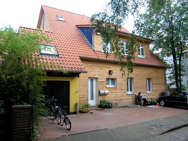 The previous owners have refurbished the 2,5-floor house at the end of the 90s from inside in personal contribution and equipped the exterior walls with a 8 cm thick heat insulation system. The asymmetric gabled roof was situated in its original condition and had a little dormer to the north side. In the course of time, the windows were refurbished as 2-disc-insulating glass with plastic frame. Annual energy need including water heating amounted recently to 260 kWh per m² living space.