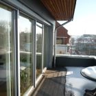 inclined wedge atop 35.6 cm wooden lightweight beams, covered by OSB roof boarding and sealing; blown-in cellulose insulation between beams; suspended plasterboard roofing with 8 cm mineral wool insulation; HTC = 0.11 W/(m2K)
