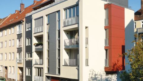 This apartment house was constructed in Nordstadt, a district primarily characterized by Wilheminen-era constructions, on a site which had been destroyed during World War II. Connected to an existing development, it provides space for six comfortable rental apartments each with a different floor plan plus an office on the ground floor. The apartments have balconies or large roof terraces and feature open-plan living, dining, and kitchen areas with large south-facing windows. An elevator makes the apartments handicapped-accessible. The underground level has a basement plus a parking garage with eight spaces.