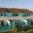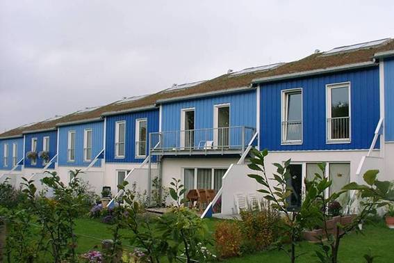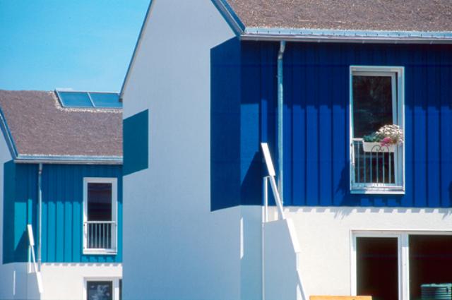 The four rows of the passive house estate are located in the district “Kronsberg”, a residential area which was new created in the context of the EXPO 2000. For the first time, thermal heat was supplied via supply air. Singularly the bathrooms were equipped with small radiators. The outstanding energy consumption is so small that it is possible to compensate the total needed residual energy for heating, water heating and electricity financially through renewable energies: with a stake of 2,6 kW in the wind power plant Kronsberg – which is included in the house price – total climate neutrality is realized.