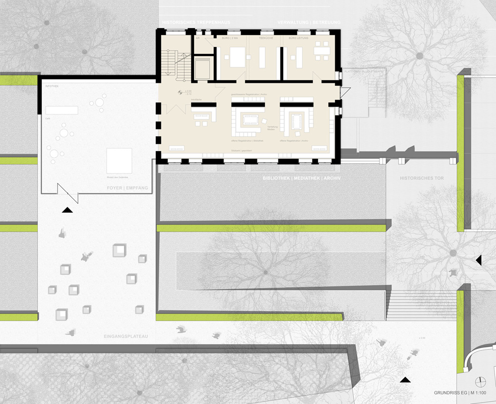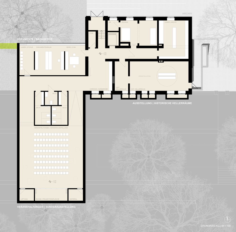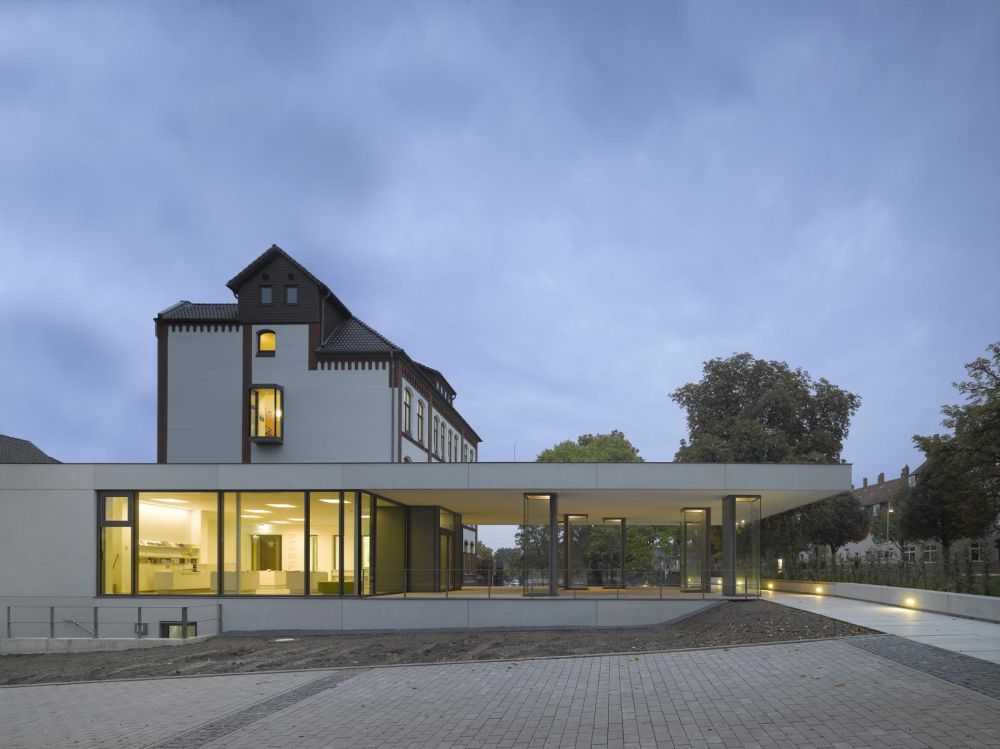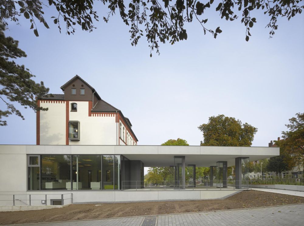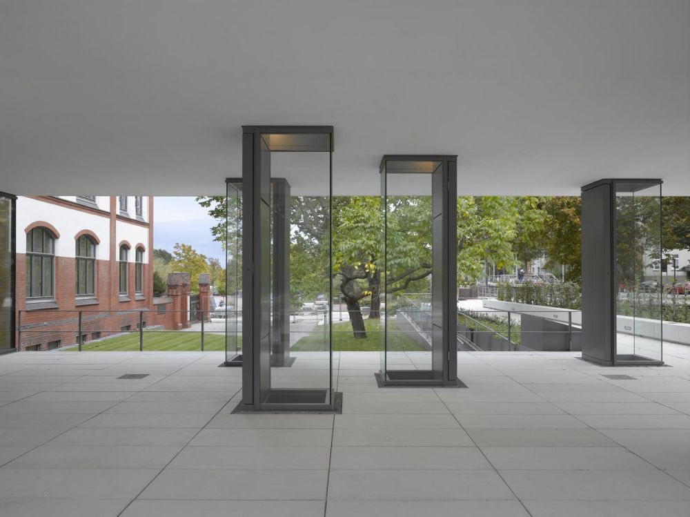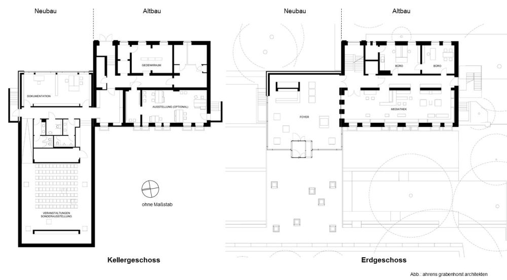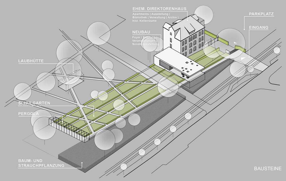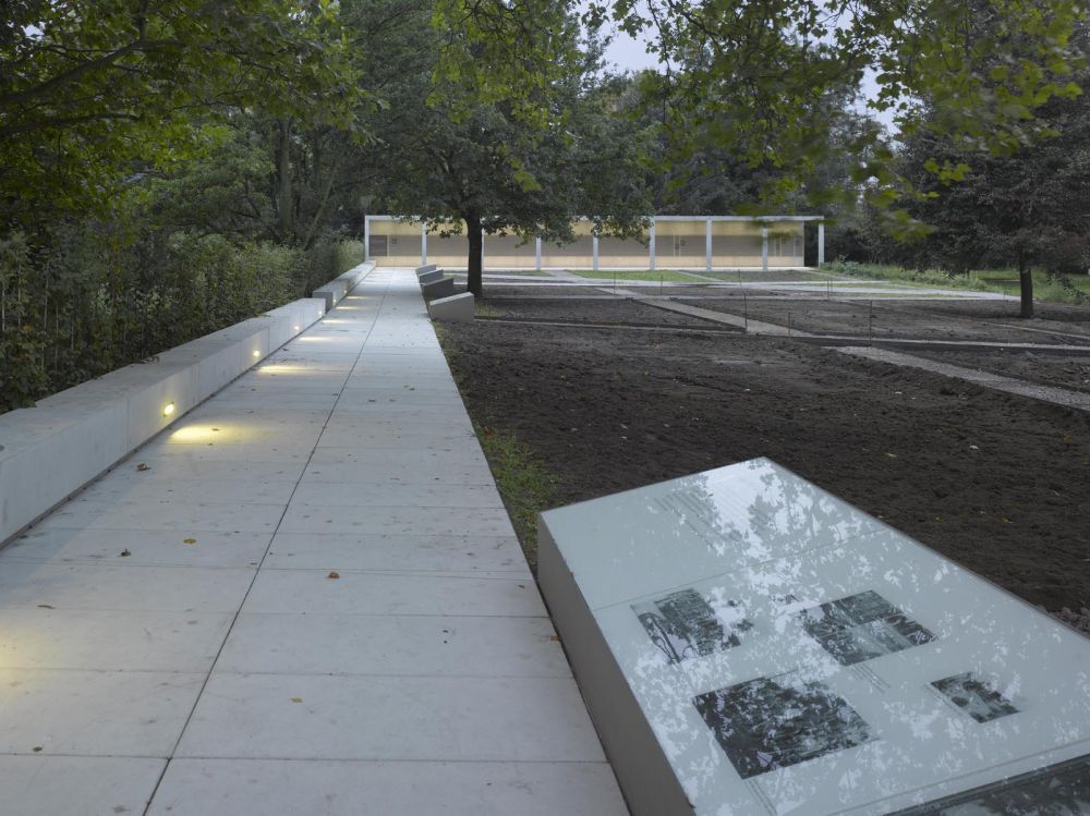 Um der historischen Bedeutung des Erinnerungsortes gerecht zu werden, wurde die Gedenkstätte zu einem zentralen Bildungs- und Gedenkzentrum ausgebaut. Dafür errichteten ahrens grabenhorst architekten ein neues Eingangsgebäude im Passivhausstandard mit einem gläsernen Foyer, das einen Sichtbezug zur neugestalteten Außenanlage herstellt. Diese nimmt in ihrer Gestaltung Bezug auf den vormaligen Schulgarten. Ein Weg parallel zur angrenzenden Heisterbergallee wird die unterschiedlichen Bereiche der Dokumentationsstätte miteinander verbinden.