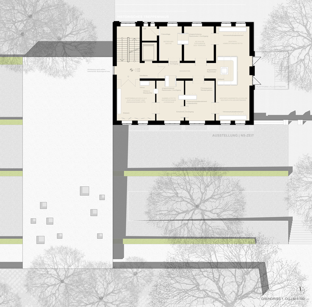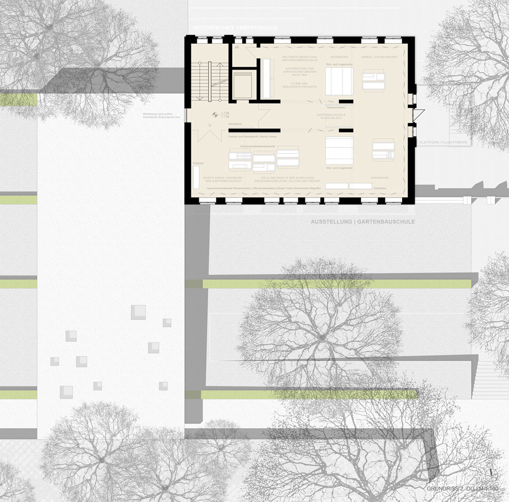 Für die neue Dauerausstellung und ihre Lernumgebung wird erstmalig das gesamte Direktorenhaus genutzt. Die Modernisierung des Gebäudeteils erfolgte mit Passivhauskomponenten. Im Untergeschoss wird eine Ausstellung die gesamte Geschichte der Gedenkstätte dokumentieren, während eine Bibliothek und eine Mediathek im Erdgeschoss zentrale Informationsstationen bieten. Im ersten Obergeschoss informiert ein Ausstellungsbereich über Ausgrenzung und Verfolgung in der Region Hannover. Im Stockwerk darüber rücken Leben und Arbeit in der Jüdischen Gartenbauschule in den Fokus und unter dem Dach werden modern ausgestattete Seminarräume Platz finden. (Quelle: ahrens grabenhorst architekten)