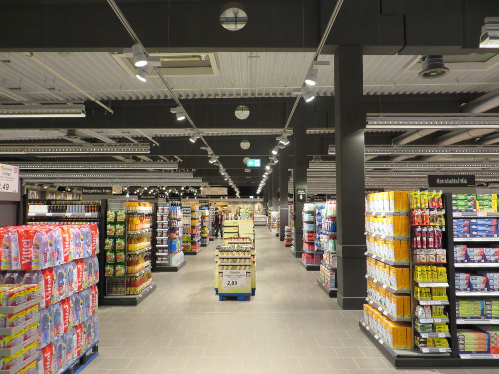 Der ausschließliche Einsatz von LED-Beleuchtung mit Langfeldleuchten und Spots sowie großzügige Oberlichter erhellen den Markt und sorgen neben einer angenehmen Einkaufsatmosphäre für einen reduzierten Stromverbrauch. Und noch eine Besonderheit hält der Markt vor: Neben einem Gründach versorgt sich der Markt auch mit eigenem Strom über eine Photovoltaikanlage. Zudem gibt es eine Ladestation für E-Autos und -Bikes sowie 40 Fahrradstellplätze.