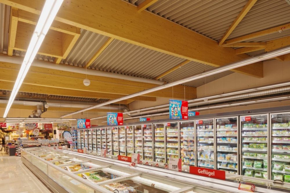 Der Wärmebedarf wird hauptsächlich durch die Abwärme der Kälteanlage gedeckt. Anstelle einer Vielzahl von Kompressionskältemaschinen erfolgt die Kälteerzeugung zentral in einer sogenannten Verbundkälteanlage. Im Sommer kann die Wärme effizient nach außen abgeleitet werden, ohne den Verkaufsraum aufzuheizen. Nur wenn an sehr kalten Tagen die Abwärme der Kälteerzeugung nicht ausreicht, wird zusätzlich eine Außenluft-Wärmepumpe eingesetzt.