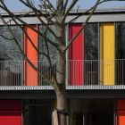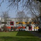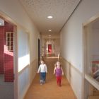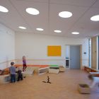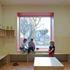 Der Kindertagesstätten-Neubau ersetzt ein langjähriges Provisorium in einem ehemaligen Schlichtwohnungsbau. Wegen eines ähnlichen Grundstückszuschnitts und identischer Ausrichtung konnte hier das Konzept der Kita Ricklinger Straße über eine Anpassung an die spezifischen städtebaulichen Voraussetzungen hinaus weiterentwickelt und optimiert werden. Der nach Südosten zum Spielhof orientierte Gebäudewinkel komplettiert das Wohnquartier aus den 90er Jahren. Um maximale Einstrahlungsgewinne für das Passivhaus zu erzielen, ist die Außenhülle zum Spielhof weitestgehend verglast. Besonderheit dieser Fassade sind die als geschlossene farbige Flächen ausgebildeten Öffnungselemente. Alle Gruppenräume der zweigeschossigen KiTa haben einen unmittelbaren Ausgang zum Außenspielbereich.