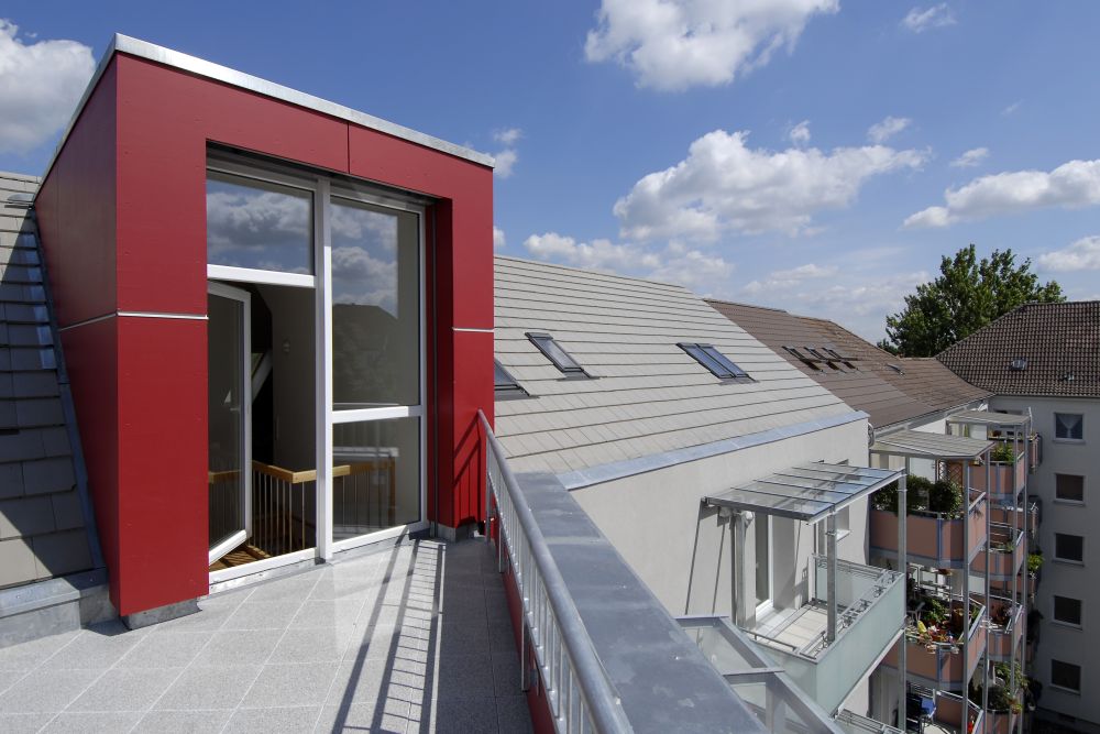 Schrägdach: neuer Dachstuhl in Stegträger-Holztafelbauweise mit 30 cm Dämmung der Qualität 0,035 W/(mK), U-Wert = 0,13 W/(m²K) Dachterrasse: 5–15 cm Gefälledämmung, Qualität 0,035 W/(mK), sowie 15 cm Basisdämmung, Qualität 0,030 W/(mK), U-Wert = 0,14 W/(m²K)