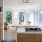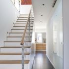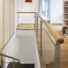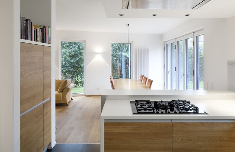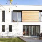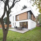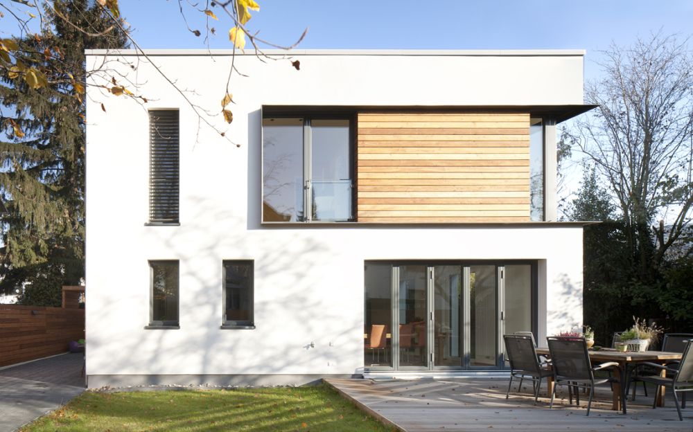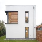 Das freistehende Einfamilienhaus auf einem beengten Grundstück ist als zweigeschossiges Passivhaus mit Garagenanbau geplant. Die Bauweise ist ein Stahlskelettbau mit Stahlbetondecken und vorgestellter Holzkonstruktion. Die Fassade besteht aus verputzten Holzfaserplatten sowie einer hinterlüfteten Holzkonstruktion im Obergeschoss.