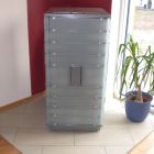 Kunststoff-Passivhausfenster mit 3-Scheiben Wärmeschutzverglasung. Die Hohlkammern des Profils sind mit Polystyrolschaum ausgefüllt. U-Wert=0,66 W/(m²K)