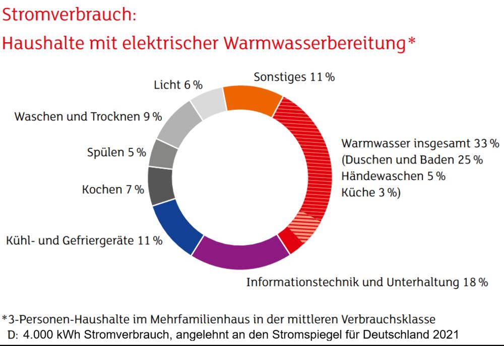 Insgesamt geht etwa ein Drittel des Haushalt-Stromverbrauchs auf das Konto der elektrischen Warmwasserbereitung. Der größte Anteil entfällt auf das Duschen und Baden.
